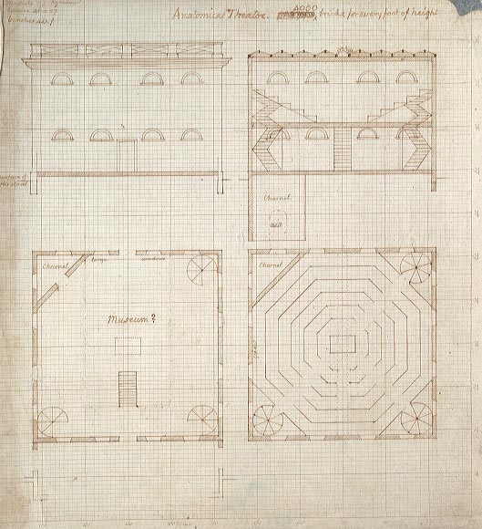 In the Fall 2008 “Retrospect,” you show a photograph that is identified as the interior of Jefferson’s Anatomical Theatre. I am sorry to say that the photo is actually of the operating theater in the first building of the University Hospital. As you can see in the scan of Jefferson’s original drawing for the Anatomical Theatre (below), the theatre itself was square and the windows were demilunes. The operating room shown in the photograph is half-round and the windows are rectangular.