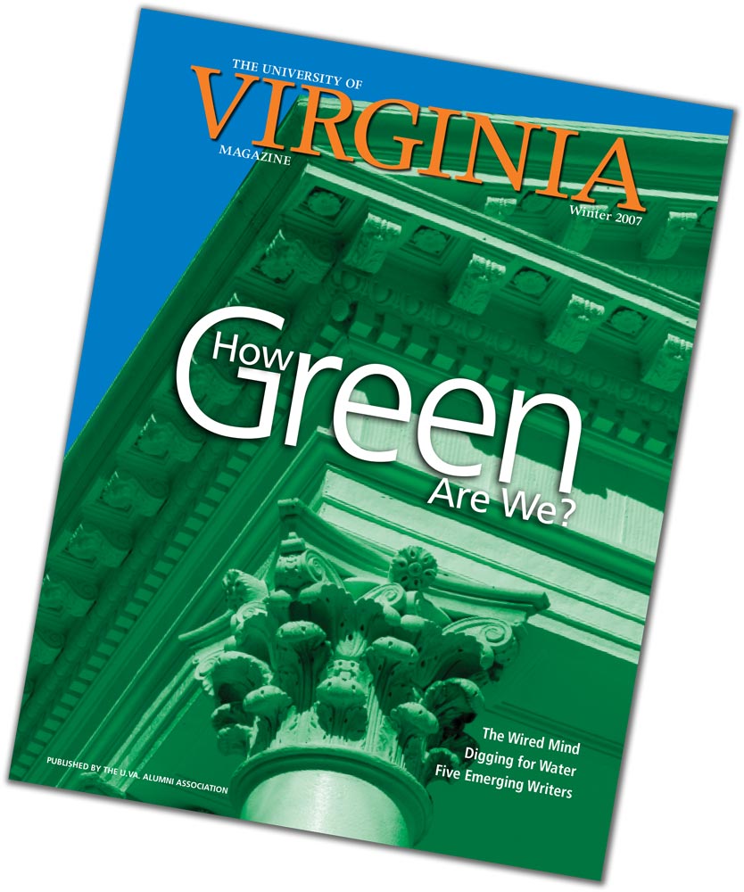 I wish to applaud your coverage of the University’s efforts to reduce its environmental footprint, as discussed in “Blue, Orange, and Green” (Winter 2007) and to also thank Mr. [Sonny] Beale and his colleagues for exceeding a 41 percent recycling rate. I had the pleasure of majoring in environmental science at the University in the early 1970s and am heartened by efforts to improve environmental sustainability on Grounds.