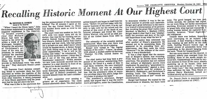 This relationship led to my being one of the very few persons to be in the courtroom the day Nixon v. United States came down. I hadn’t even asked the justice’s staffers whether I might be able to see it. They simply told me, proactively, that, as their guest political scientist, they wanted to make sure that I got in.