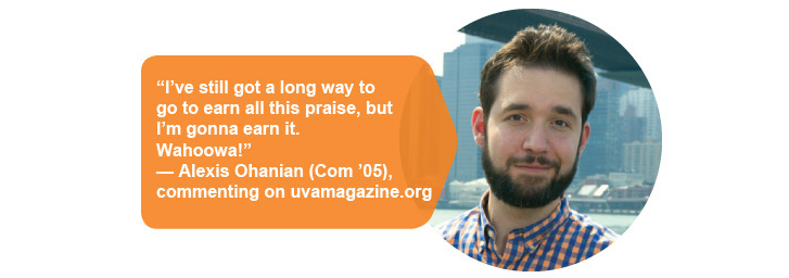 You don’t know how much your work is appreciated, Alexis [“The Voice of His Generation: Reddit co-founder Alexis Ohanian fights for a free and open Internet,” Fall 2014]. We use the products you helped build on a daily basis and our life is a little bit better because of them. Thanks for being a model for all of us at UVA.