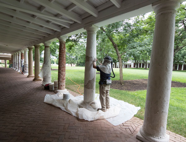 The gymnastics that the University is going through to determine the appropriate approach to the column finishes at the Academical Village is baffling. The modern whitewash on the columns is historically inappropriate, based on a nostalgic ideal of the 19th century. The two “restored” columns with their light gray stucco finish have weathered the storm of cyclical weathering that distresses the remaining columns, an issue of water getting trapped in the column which then spalls off the stucco finish. When left unpainted the columns can expel water through their permeable surface. Year after year [University officials] spend the time and money to make costly repairs, so that the visitors to the Lawn may be assuaged by the familiar white columns. In my experience [in historic preservation], returning to original finishes and colors is always a prudent and wise decision, in this case both aesthetic and functional. The user, after a brief period of distaste, adjusts to the difference and accepts it forgetting their preconceived notions about what something ought to be.