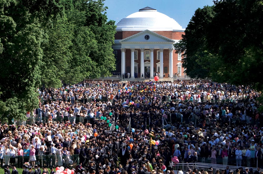 “It’s a puzzle—we’re trying to fit all of these diploma ceremonies into the various facilities,” Higgins says. This year, she has a new asset to deploy: the John Paul Jones Arena, which can seat about 14,000 in air-conditioned comfort, though that is still not nearly enough to accommodate the 30,000-plus expected to roll into Charlottesville.
