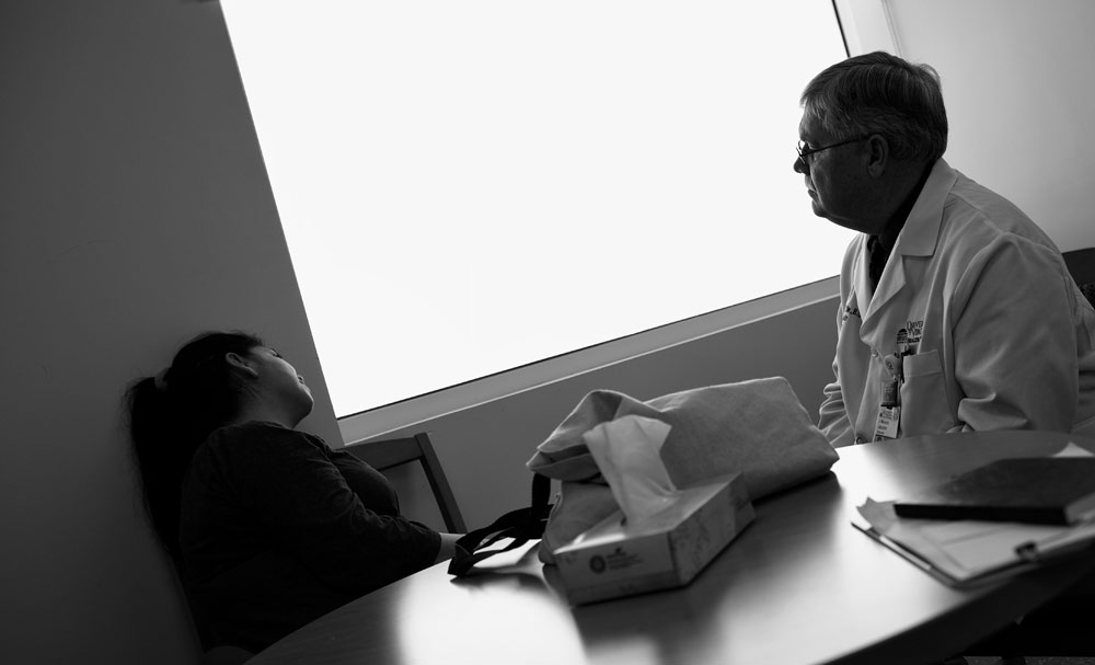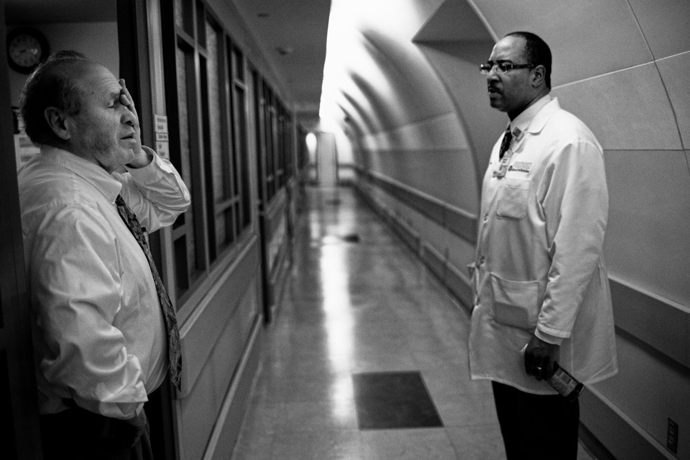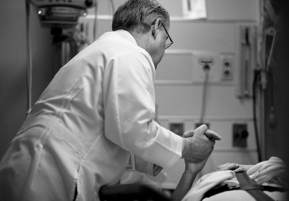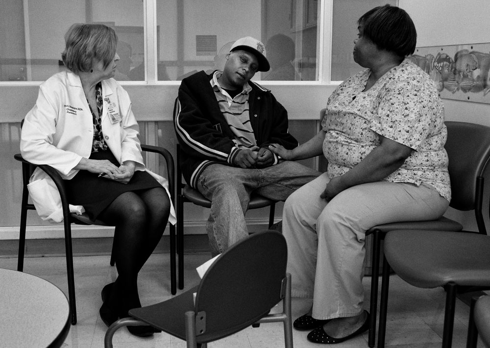 DARKEST HOURS Chaplaincy resident Patricia Hendricks meets in an emergency department waiting room with family members of a patient who suffered an aneurysm and was not expected to live. A relative outside of the patient stands alone outside the room.