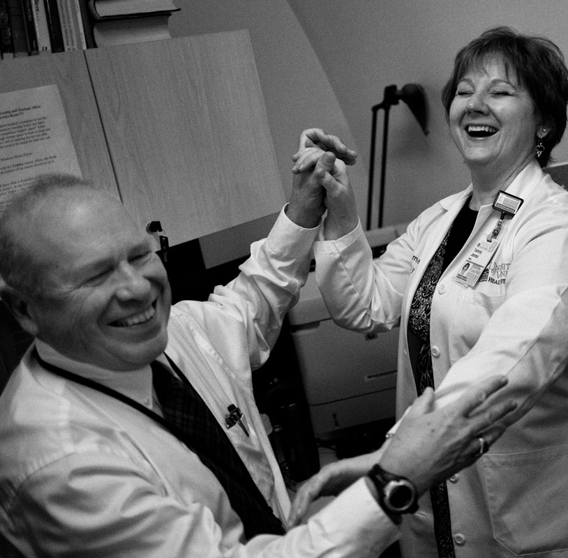 A MOMENT OF LEVITY Chaplain Don Moore and Tammy James, a chaplaincy resident, celebrate the birthday of another chaplain after a morning meeting.
