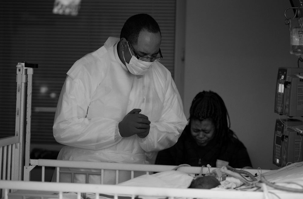 Coleman prays over a 9-week-old boy quarantined in the pediatric intensive care unit with a severe viral infection. The boy's mother is pictured behind Coleman.