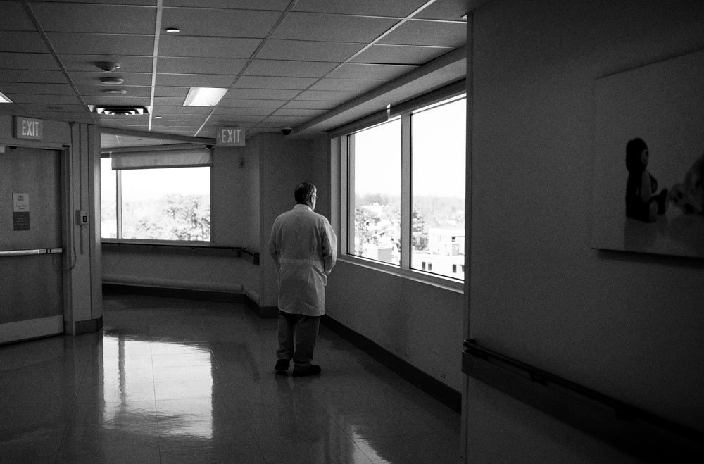 AFTERMATH After sitting for several hours with the family of an infant who died, Melvin Janzen takes a moment to reflect outside the pediatric intensive care unit.