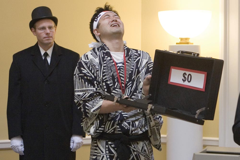 An experiment in risk and randomness ended badly for first-year Darden student Hideki Inoue. Identified as Darden’s “luckiest student” through a series of random drawings, Inoue could have won a $17,500 scholarship—a full semester’s tuition. All he had to do was choose between two briefcases and pick the one that contained the money; unfortunately, he guessed wrong and walked away with no more than a memorable learning experience.
