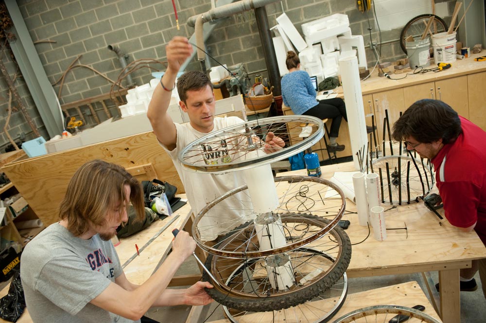 "This class is all about thinking through making," says Melissa Goldman, the Architecture School’s fabrication facilities manager, who leads the class along with Steven Warner, technical director of the Department of Drama, and Eric Schmidt, the studio and gallery technician of the McIntire Department of Art. "We cover the whole gamut, from theory to practice."