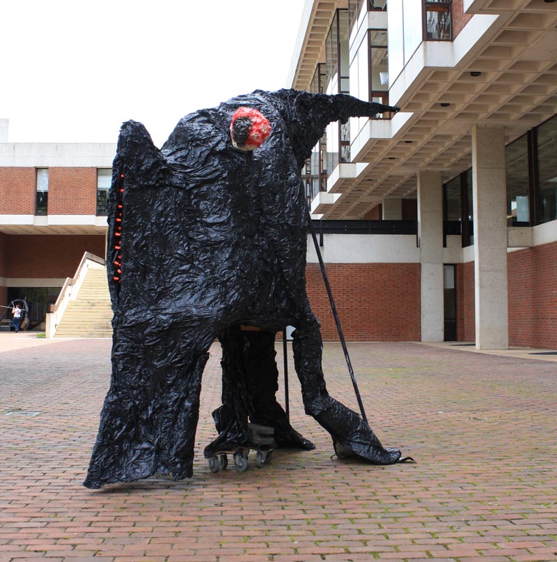 Quincy sat in the corner of the drama studio until two of its creators, Jess Burnam (Col class of ’14) and Mark Molchany, camouflaged in garbage bags to match the monster’s asphalt-like skin, stepped inside the monster to move its wild red eyes and propel it slowly forward while Jake Fox (Arch class of ’17) and Jake Kvanbeck (Grad class of ’18) manipulated its hind legs from the outside.