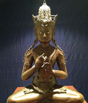 “Vairochana is a representation of a primordial Buddha in the conception of the Five Wisdom Buddhas. Vairochana was often represented in bronze, seated in a pose of contemplation; the tiara and ornaments convey a state of bliss. This particular sculpture is a tour de force of bronze-casting and possessed of a hypnotic character that makes one stop in one’s tracks.”