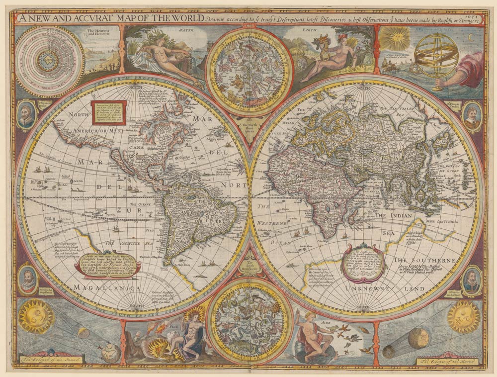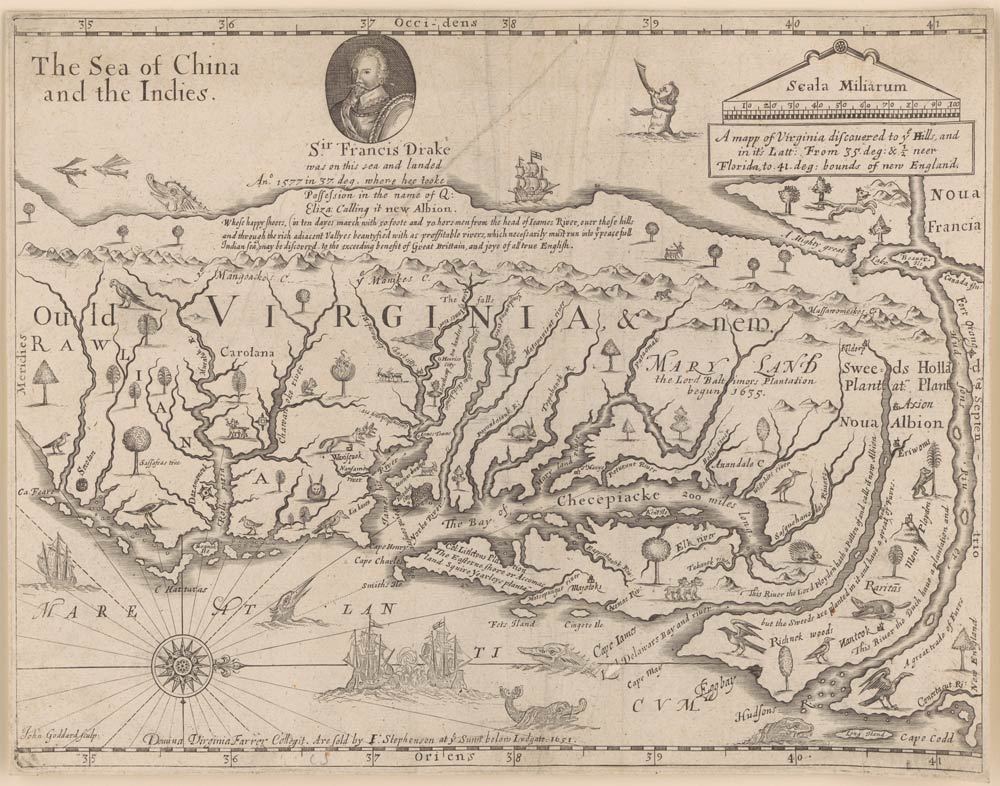 Some, such as a 1651 map showing Virginia only a 10-day march from the Pacific Coast, lack veracity. “A lot of the maps are wishful thinking; this is a classic case of wishful thinking,” says exhibits coordinator Mercy Quintos Procaccini (Col class of ’94). Others reflect more critical standards, such as the 1676 map “drawne according to the truest Descriptions, latest Discoveries and best Observations.”