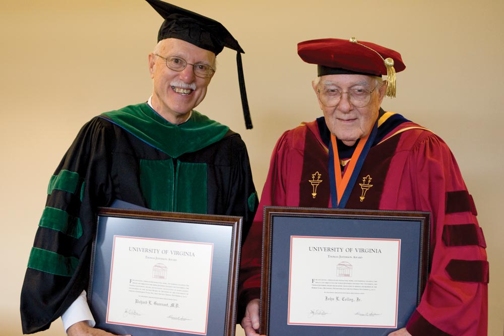 John L. Colley Jr., a 43-year veteran of the Darden School faculty, and Dr. Richard L. Guerrant (Med class of ’68), director of UVA’s Center for Global Health, received the 2010 Thomas Jefferson Awards, the highest honors the University bestows upon its faculty. Colley received the award for excellence in service, recognizing his many years as a teacher, leader, mentor and adviser, including contributions to the Raven Society, Honor Committee, Jefferson Scholars Foundation and the Athletics Department.