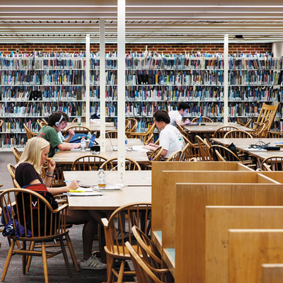Clemons Library, open 24 hours a day, is a popular space for cramming at exam time; its Robertson Media Center is another big draw, offering spaces for animating, podcasting and film editing.