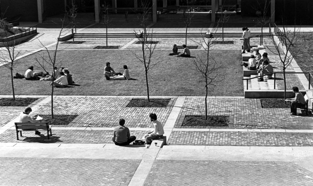 Built largely on tight state budgets, the academic buildings that went up on North Grounds—Law in 1974 and JAG and Darden in 1975, all designed by Hugh Stubbins and Associates—nodded toward Jeffersonian ideals in their materials, hues and placement relative to each other. A 200-foot lawn—the same width as the Central Grounds version and playfully called “Red Square”—separated the law and business schools, and both buildings faced inward to it and toward each other. Other elements, including the vast parking lots adjacent to the buildings, acknowledged more contemporary priorities. “Although the designers of North Grounds chose various elements of the Academical Village to reinforce a connection with the historic campus, the commuter campus much more heavily influenced the design program,” Herrington writes. “Access, efficiency and economy were top priorities.”