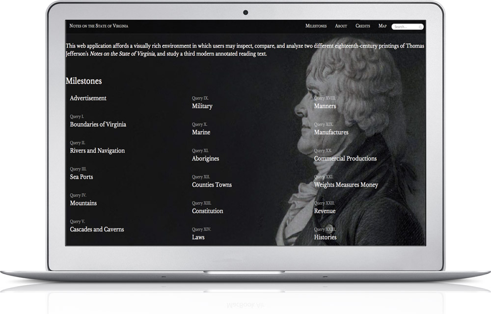 To make the book and Jefferson’s additional notes available to a wider audience—it’s one of the library’s few “restricted” holdings—O’Brien and Pasanek secured seed money from the Alumni Association’s Jefferson Trust and worked with students and the Scholar’s Lab to create a Web application. The app, which is accessible on any computer, tablet or mobile device, “affords a visually rich environment in which users may inspect, compare and analyze” two editions of Notes and a modern annotated and searchable text.