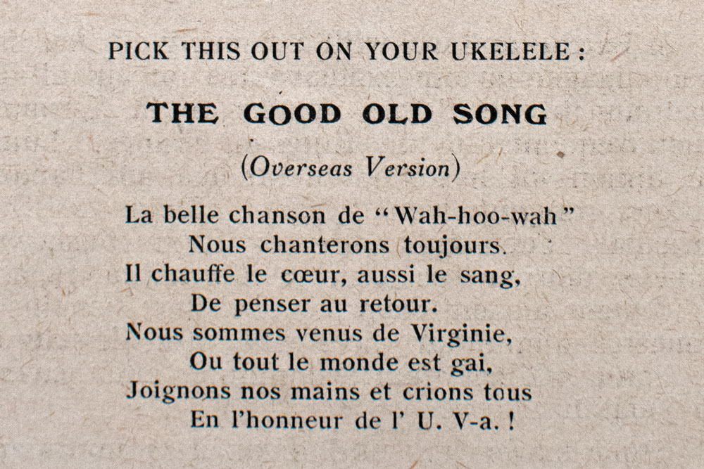 In less than 5 weeks, Crenshaw conceived and orchestrated a two-day commemoration and reunion, both dignified and festive. Letters, ledgers, reports and mementos in the Albert and Shirley Small Special Collections Library show that he recruited generals, diplomats, Paris municipal chiefs and a descendant of Thomas Jefferson as speakers; arranged a performance by a 70-piece U.S. Army band; commissioned a monumental marble-and-bronze plaque to be mounted at the location of Jefferson’s Paris residence when he was minister to France (1785–89); procured hundreds of pounds of food and hundreds of boxes of cigars and cigarettes from the Army Commissary; obtained permits to construct a speakers platform and block traffic at an intersection along the Champs-Elysees; and even secured an order from the high command of the American Expeditionary Force that gave Virginia alumni in uniform special permission to leave their posts all over Europe to attend the Founder’s Day events in Paris. He cajoled American and French newspapers, along with three newsreel crews, to publicize and cover the event; and booked an excursion boat (renamed “Wah-Hoo-Wah”) for a day trip down the Seine. Crenshaw even personally composed the inscription on the plaque celebrating Jefferson, France and UVA. And in the middle of the dedication ceremony he placed a rendition of his own French translation of “The Good Old Song”: