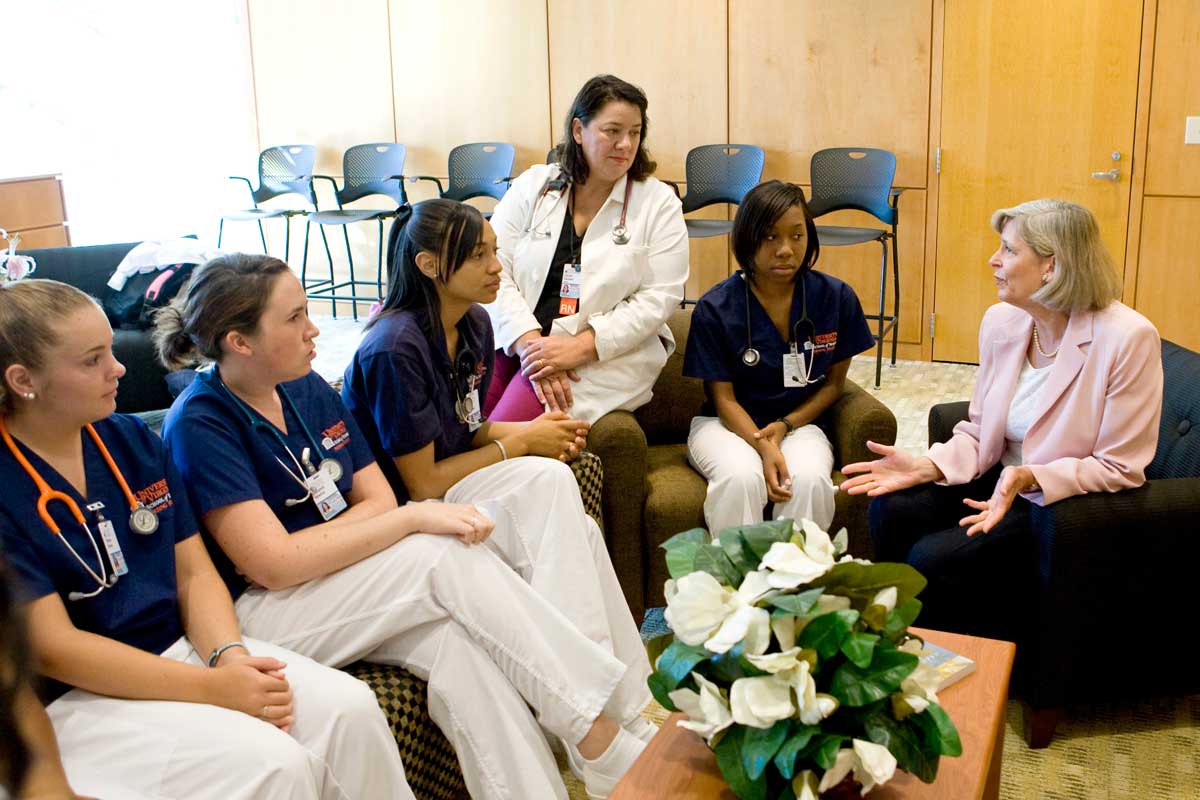 Dorrie Fontaine (right), dean of the Nursing School, speaks with students. Even with increased enrollment, the University offers a 15-to-1 student-faculty ratio.