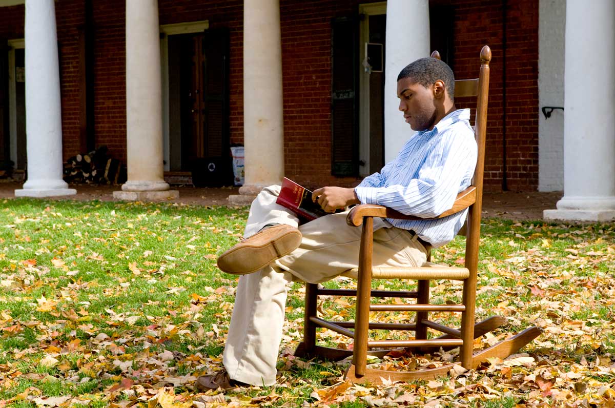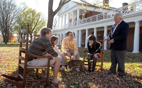 Continuing the ideals of Jefferson, students and faculty share their intellectual and social lives. Associate dean of students Aaron Laushway (Educ ’84, GSBA ’87) greets students on the Lawn.