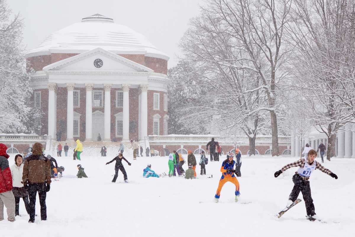 The Lawn takes on a festive air during a snowfall.