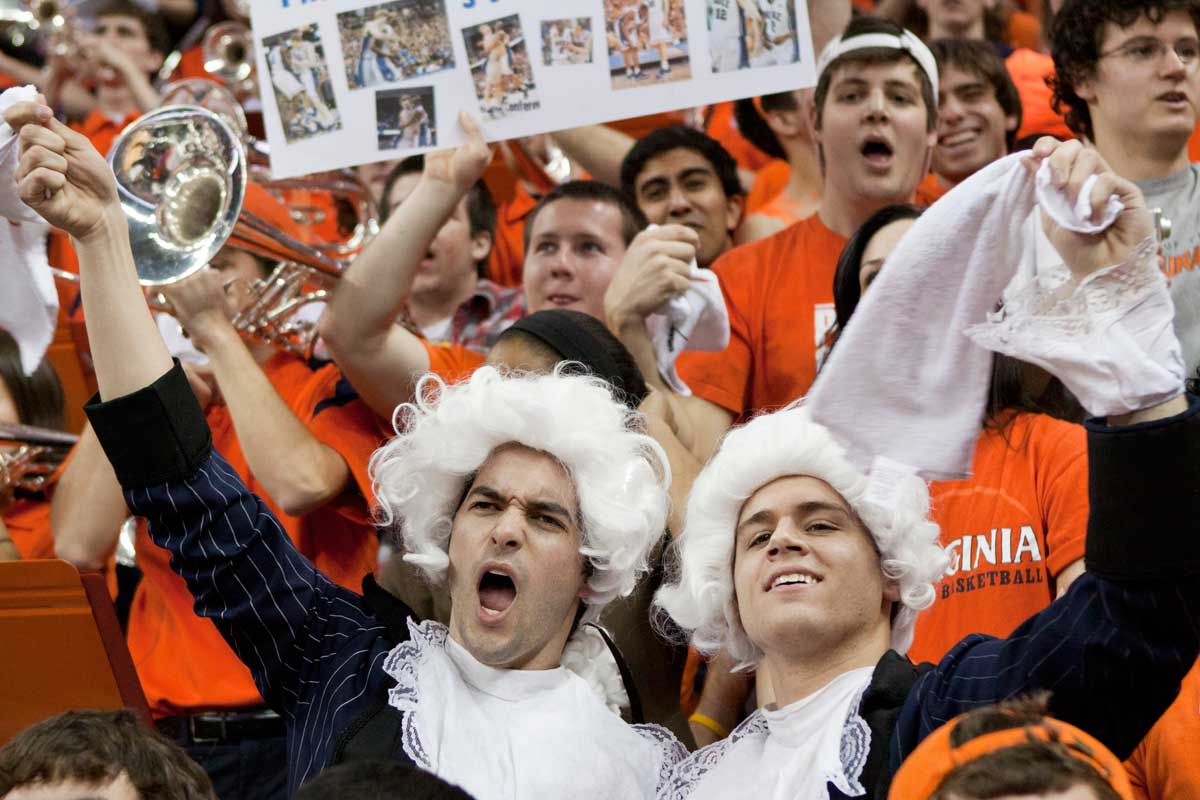 Kyle Emory (Com class of ’12) and Michael McGarry (Col class of ’13) channel Thomas Jefferson in their support of the Hoos at John Paul Jones Arena. The pair was also conspicuous at football games in Scott Stadium. Virginia men’s and women’s teams captured four ACC championships during the 2011-12 academic year (with baseball yet to be determined as of press time) and have won 51 conference titles during the past decade.