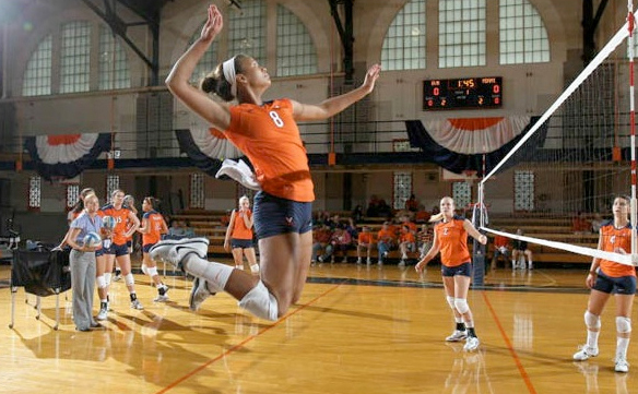 Tori Janowski (Col class of ’15) warms up before a volleyball match in Memorial Gymnasium. Opened in 1924, Mem Gym still provides a place for students to exercise and is the home of the Cavalier volleyball and wrestling teams.