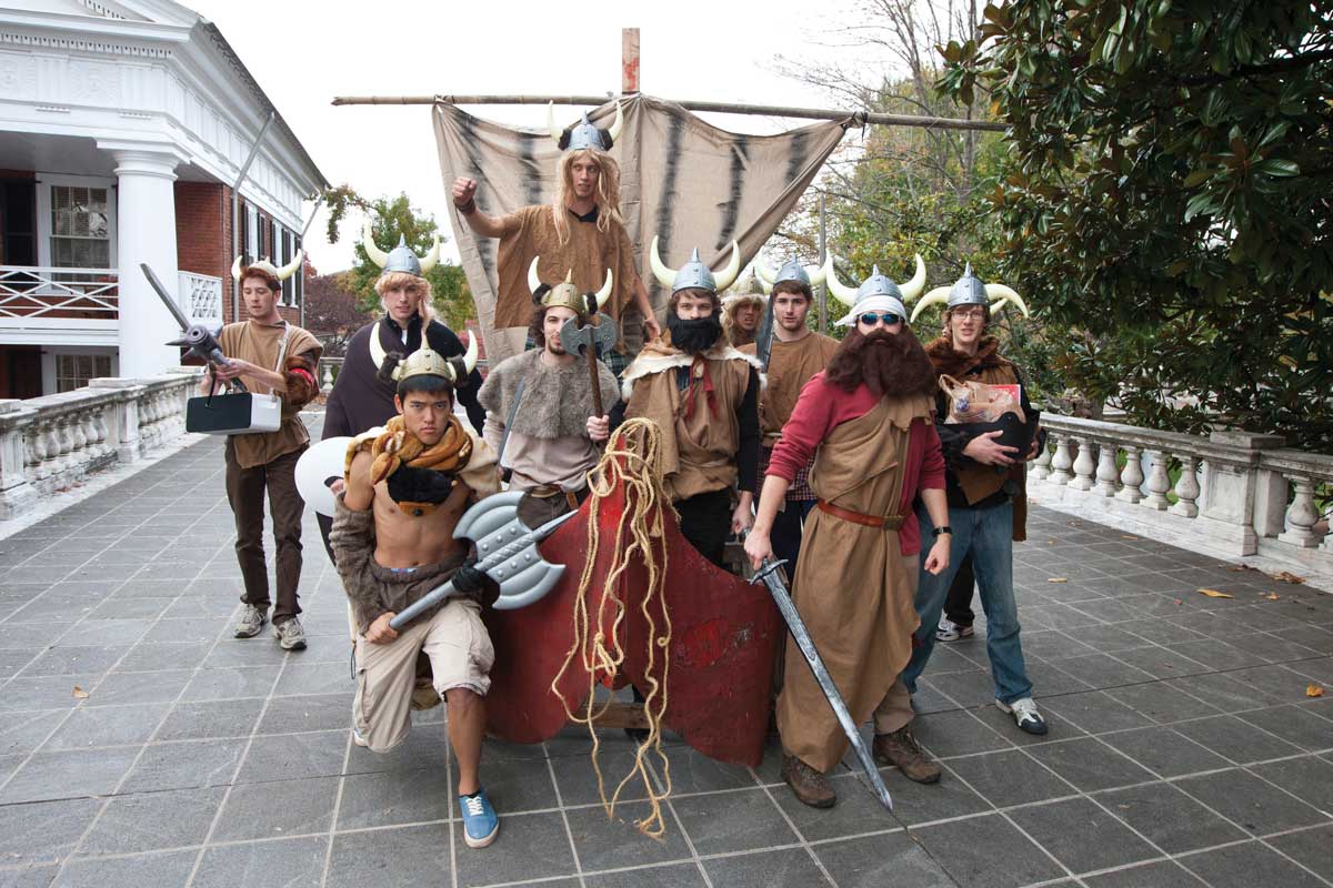 Halloween on the Lawn is a tradition that brings together the Charlottesville and University communities. Many students get in on the act, including members of the Agape Christian Fellowship who sail their Viking ship among costumed children trick-or-treating on the Lawn.