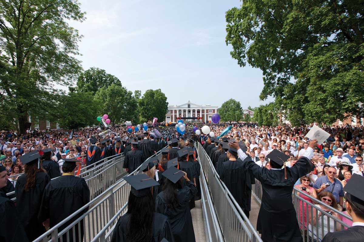 More than 6,000 students proceed down the Lawn during Final Exercises. The weekend’s logistics are complex. These new graduates will walk past approximately 20,000 chairs that Facilities Management employees have set up for the occasion. Another 25,000 chairs are set up for events and ceremonies at 50 sites around Grounds.