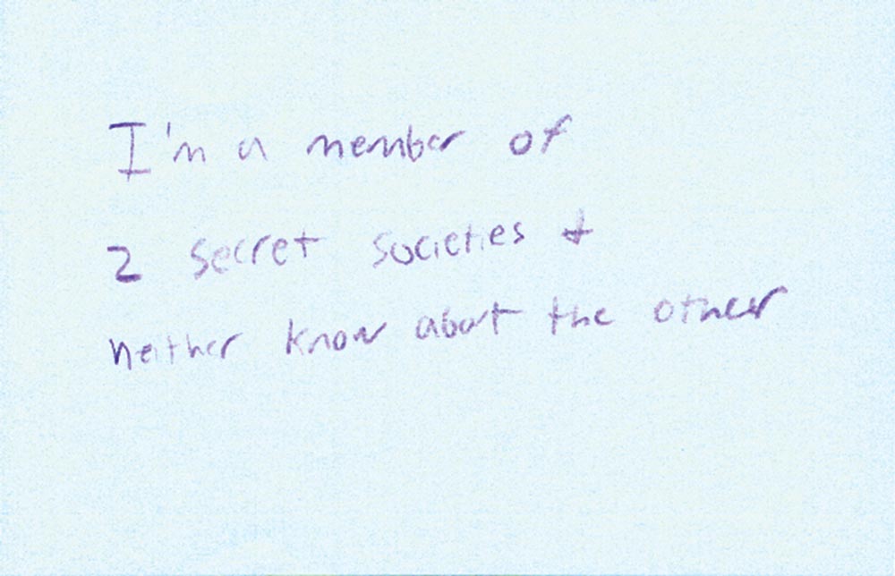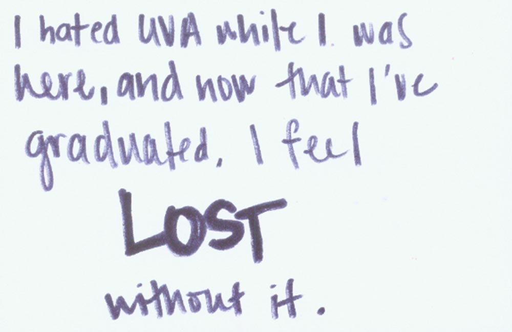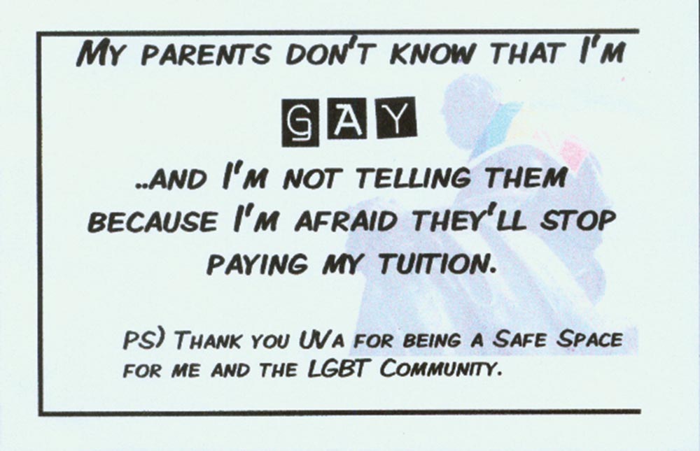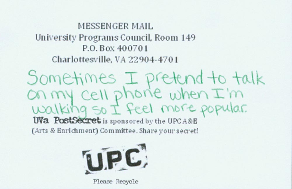 Mallow adds that the exhibit included information about UVA’s health and counseling resources because the “secrets raise very intense feelings and issues.” The exhibit featured hundreds of secrets, nearly covering the walls of the Newcomb Hall Art Gallery. The cards ranged from humorous to heartbreaking. Here are just a few.