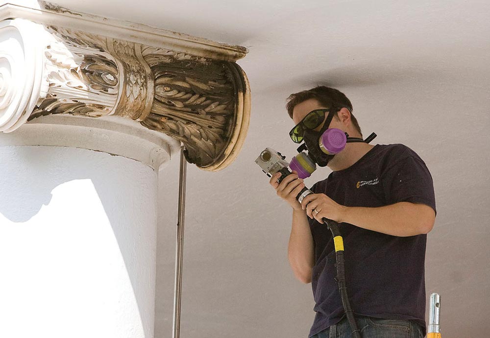 Leigh Hassler (Arch class of ’00) and colleague Roy J. Ingraffia of Milner + Carr Conservation undertook the painstaking work perched on scaffolds on the pavilion balcony. They wore eye protection and a breathing apparatus while wielding the laser, which cleaned a quarter-inch area with each stroke.