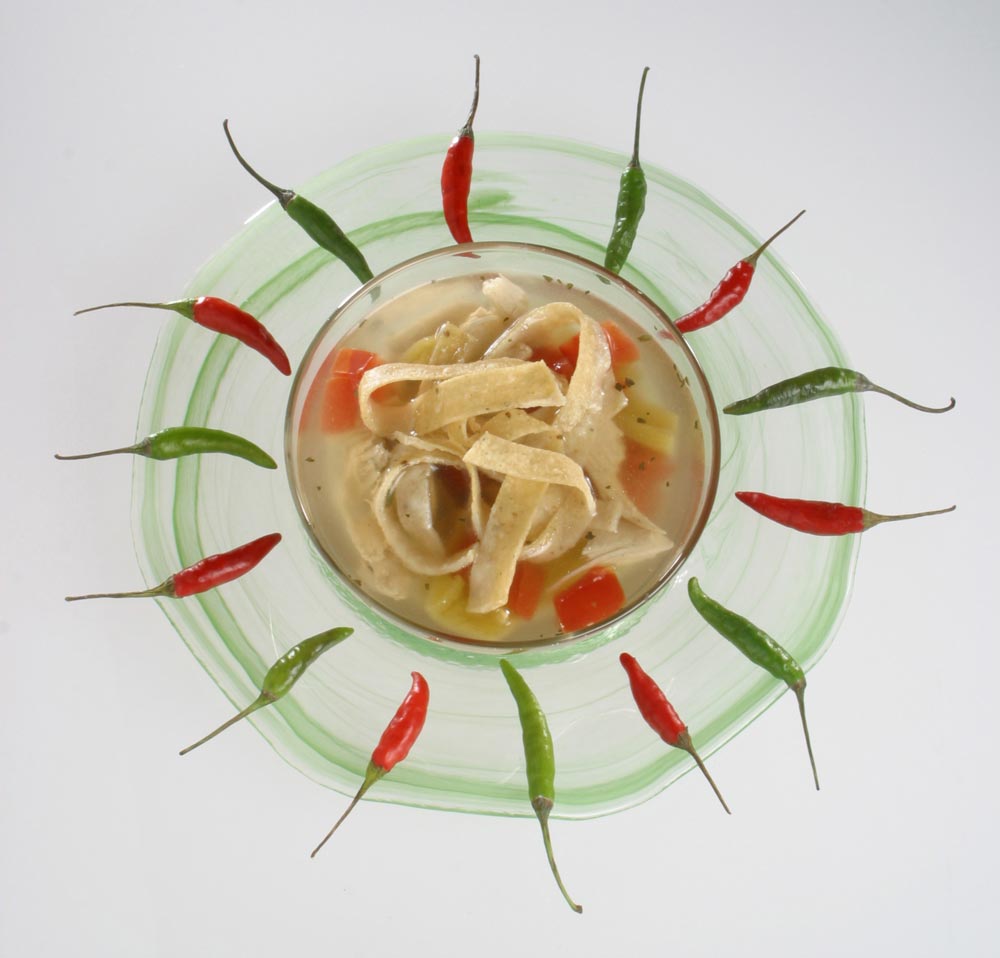 There are many variations of soup with tortillas throughout Mexico, and this is one that is popular in the Yucatán Peninsula. Chicken is commonly used, but you can substitute leftover turkey in this delicate soup. The Mexican limes that are used in the Yucatán Peninsula differ from the Persian limes that are common in the United States in that they are smaller, darker green and more tart. Although they are preferred, any lime can be substituted. Be sure to add the tortillas right before serving or they will become soggy.