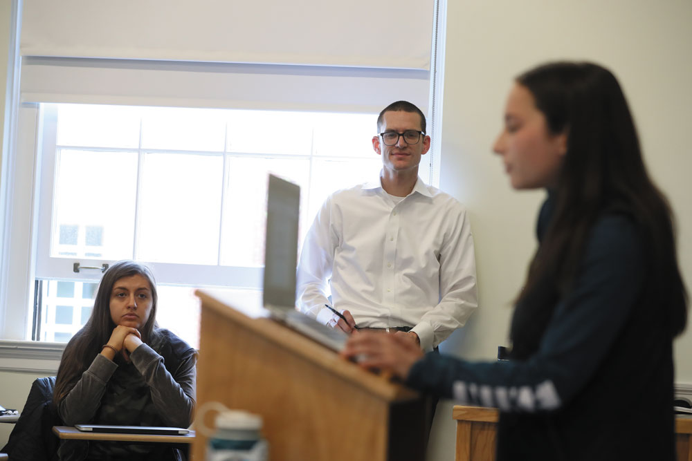 Though student back-and-forth consumes the bulk of the class, the professor gets first crack at each argument. Quick on his feet, he challenges positions and clarifies arguments with pointed but constructive questions.