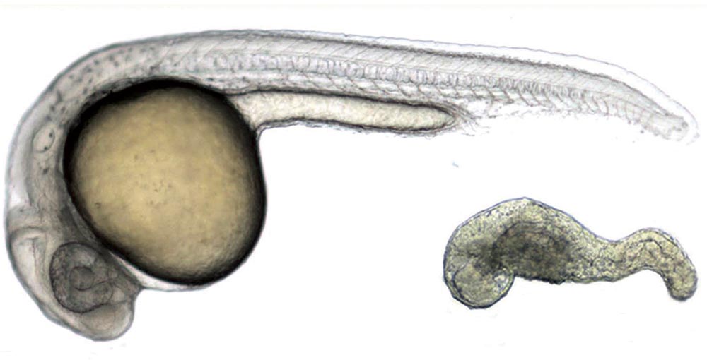 UVA scientists have created a zebrafish embryo by instructing stem cells. Embryo wild-type (left), embryo constructed (right)