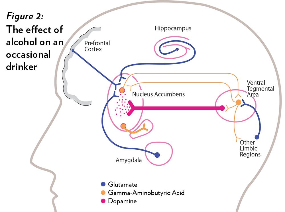 The natural release of dopamine is the key to pleasure. When we eat, drink or have sex, dopamine floods the brain’s reward system (the nucleus accumbens, ventral tegmental area, hippocampus, amygdala and other parts of the limbic region). Glutamate, another brain messenger, also comes into play by exciting dopamine neurons.