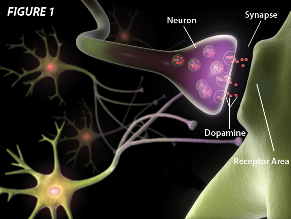 Dopamine is a brain chemical. It serves as a neurotransmitter—a messenger carrying signals between nerve cells known as neurons. These neurons communicate by sending electrical signals that are conveyed to receptors across a small gap called the synapse. Dopamine is released into the synapse, and binds to the receptors of another neuron. In order to maintain balance, some nerve cells release an inhibitory neurotransmitter (gamma-aminobutyric acid, or GABA) that works to prevent the receptor from being overstimulated.