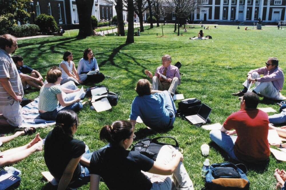 Ernest “Boots” Mead (Col class of ’40), a professor of music, taught his last liberal arts seminar a few months before his death in 2014 at age 95 (having “officially” retired in 1996). Mead himself studied at the University in the late 1930s, joining the faculty in 1953 and receiving the Thomas Jefferson Award in 1989. His close work with students was legendary. Mead created a popular fourth-year liberal arts seminar, and when he retired, hundreds of his students established an endowment in his name.