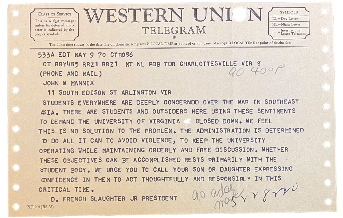 UVA’s Special Collections library includes one of the original telegrams, discovered for this story inside a manila folder of 1970s Student Council miscellany. The tissue-thin, buff-colored Western Union form is a relic of an earlier time, but not 1970. Telegrams were well on the wane by then. More like 1940. So it was that the medium, the message and the motivation behind both captured all too well the animating conflict of the era: generational divide. Amid times awash in psychedelic color, alumni leaders borrowed a trope from a black-and-white B-movie. Operator, get me Western Union!