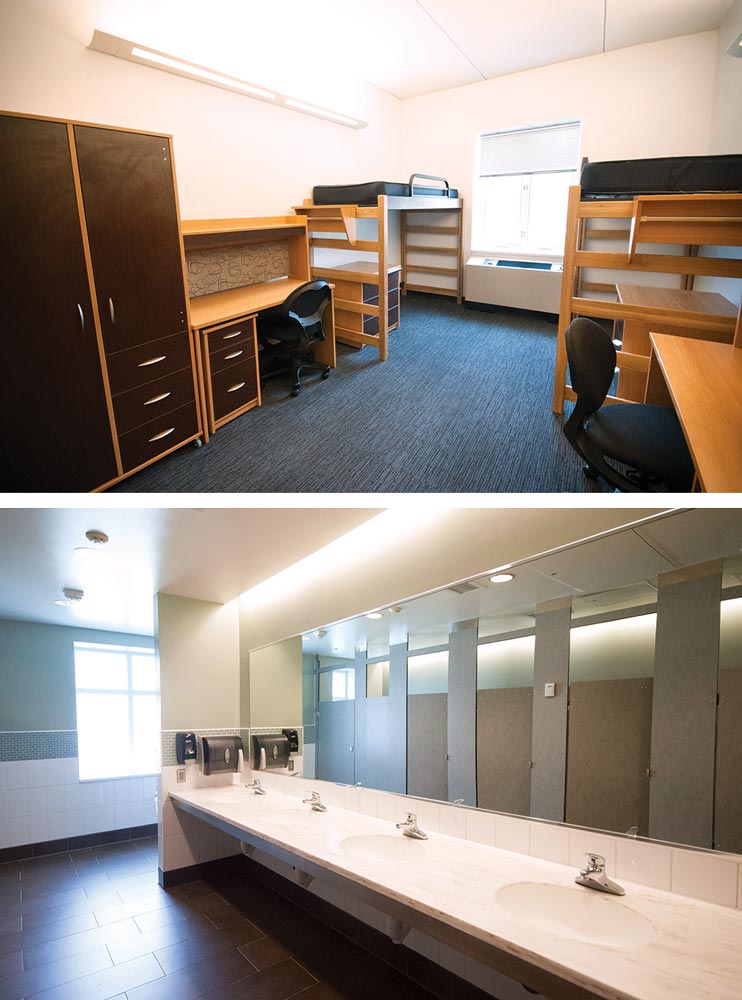 Top: The bedrooms, which have lights with occupancy sensors, are designed for two students each and have loft or adjustable-height beds to leave extra floor space underneath.