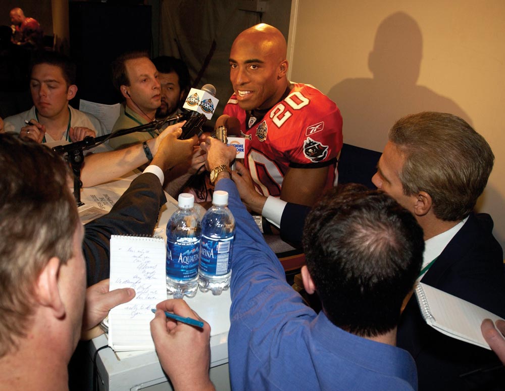 Ronde is a three-time All-Pro selection and three-time Pro Bowler. He has logged better than 100 tackles in each of the past three seasons. This year, he became the first cornerback ever to register both 20 interceptions and 20 sacks in a career. But, in classic Ronde fashion, the real impact of his achievements is less immediately discernible than Tiki’s. Simply put, Ronde Barber plays the game of football like no one else in the game. He’s smaller and quicker than most NFL cornerbacks, which allows him to cover the field in ways that are constantly surprising to offenses. To become the first-ever cornerback in the 20/20 club is an almost bizarre achievement that demonstrates a de facto redefinition of the role of that position. Asking a cornerback to be in position to intercept or go for a sack on a given play is to ask a player to be in two very different places at once, roughly akin to asking your pitcher to play first base also. But, says Ronde, the key to his ability boils down to something simple: “I just do things that not everyone else is willing to do, like hitting guys who are 150 pounds heavier than me.”