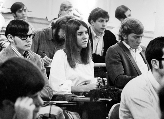The women in my class constantly walked into uncharted and often hostile territory. With a 20-to-1 ratio of men to women, a class of 200 would on average have 10 girls. When we entered a classroom, we usually stood out like sore thumbs. One day, I was running a little late and arrived at my class a few minutes into the lecture. I gingerly opened the door and tried to quietly slip in unnoticed. The class had about 150 students and every seat was taken. The dress code of the day for women was miniskirts and platform shoes. Sitting on the floor was not a viable option. As I scanned the room, hoping to find an empty seat, the room got very quiet. The professor stopped talking and turned his attention to me, standing awkwardly just inside of the door. “We’re happy you decided to make it, Miss Shotton,” he said. Then, his voice dripping with sarcasm, he said,” Now, which one of you Virginia gentlemen would like to give this little lady their seat?” No one budged. My heart was pounding as an entire room of mostly young men turned their heads and looked at me with defiance and amusement.