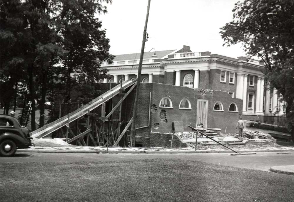 As opening day for students approached in 1825, state officials—lobbying for funds to create their own medical school in Richmond—criticized Jefferson’s plans for medical instruction. Officials argued the University would not offer sufficient hands-on learning for aspiring doctors (and the pavilions were certainly not ideal locations for dissecting human cadavers). Jefferson responded by designing the Anatomical Theater in February 1825. In keeping with his vision for expanding the Academical Village with a parallel row of buildings on West Street, he sited the theater just opposite Hotel A of West Range. In 1929, dissections were moved from “Stiff Hall”—as it was known to students—to a newer facility in the growing medical complex, which had first opened down the hill from East Range in 1901. The theater continued to provide storage and office space as it gradually fell into disrepair. In 1939, the University razed Jefferson’s Anatomical Theater out of concerns that it marred the view of the new Alderman Library, which had opened the year before.