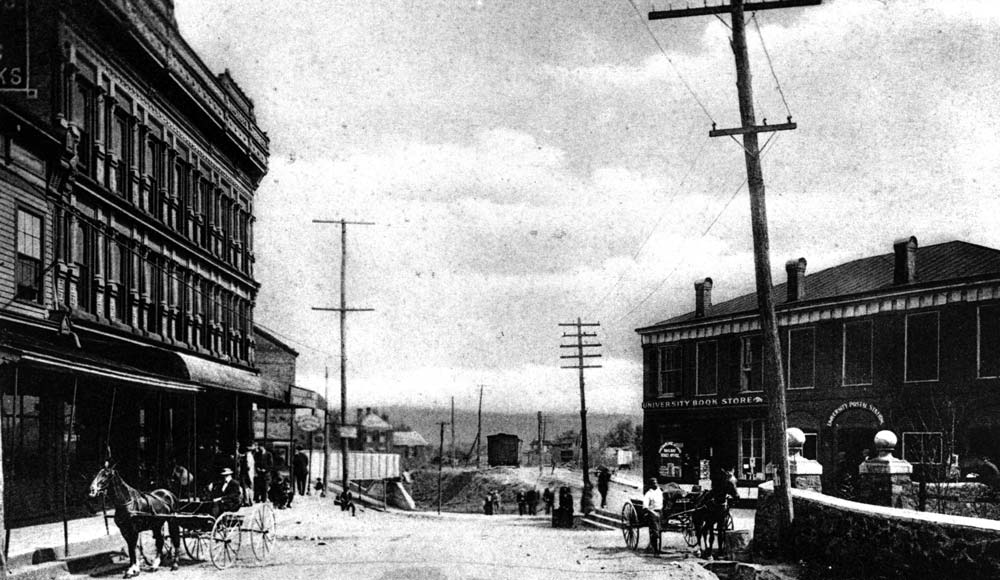 This is believed to be the first picture postcard of the UVA Corner, taken not long after a tunnel for University Avenue was dug beneath the railroad tracks. The project commenced in July 1901. Laborers worked through that summer and into the fall fighting the tenacious Virginia clay with picks, shovels, mules and draglines. They managed to dig out University Avenue on both sides of the railroad tracks, and graded 14th Street to meet the new level of the intersection. From downtown, the road was paved with bricks only as far as the new trestle, which then marked the city limits.