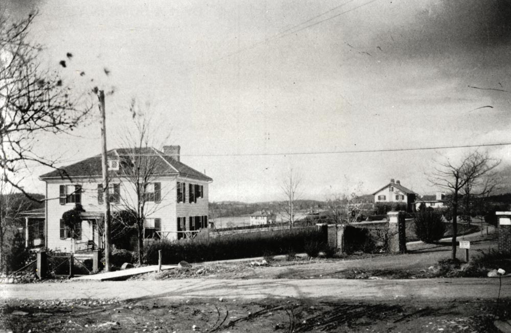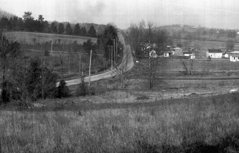 Looking west from Carr’s Hill, this photo shows the Ivy Road section of the newly paved U.S. 250, on its way to the Shenandoah Valley and beyond. This photo was taken several years before the Lady Astor Tennis Courts were opened in 1931. The courts were the result of a generous donation from Lady Nancy Astor, a native of Danville, Va., and the first woman elected to the British Parliament. The buildings to the right, at the intersection of Ivy Road and Emmet Street, included the Eddins family’s University Dry Cleaning Works, which cleaned and pressed suits for generations of students. That land is now the site of the Cavalier Inn, which was purchased by the University’s Real Estate Foundation in 1998.