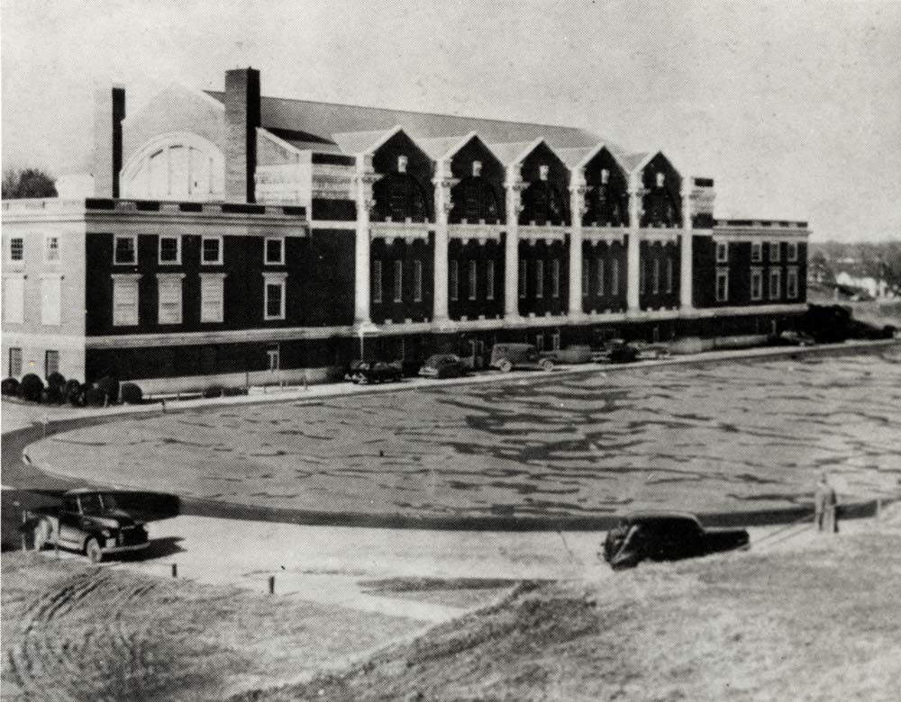 Just west of the University’s “ice pond,” ground was broken in spring 1922 for what then would be the largest gymnasium in the South. Named in honor of alumni who had died in World War I, Memorial Gymnasium officially opened in 1924. It replaced Fayerweather Gymnasium, built in 1894, which was subsequently converted to house the art department. Water from Meadow Creek, which had fed the old pond, was rerouted into a fashionable reflecting pool. By the summer of 1952 the pool had become a “sunken mire,” full of carp, trash and floating beer cans, according to the Cavalier Daily. The reflecting pool was filled in and converted to a much-needed parking lot. Memorial Gymnasium continues to be an important and historic part of the University’s athletic facilities.