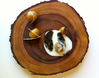 To plate: Liberally dust the black butter potatoes with sauerkraut powder and mix well to coat them. Dust the buttered apples with onion ash on one side only. Spoon some onion crème fraîche onto a plate and artfully arrange the potatoes and apples. Finish with a few paper-thin slices of raw onion. Enjoy, and drink plenty of wine to your heart’s content.