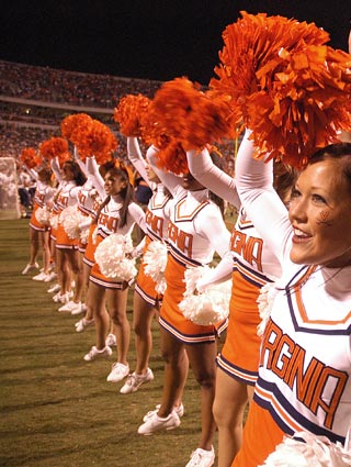 It’s a Thursday night in John Paul Jones Arena, and UVA’s cheerleaders are refining their pyramids, poise and polish before Saturday’s football game, when they will lead nearly 60,000 fans in energetic, high-volume support of the Cavaliers.