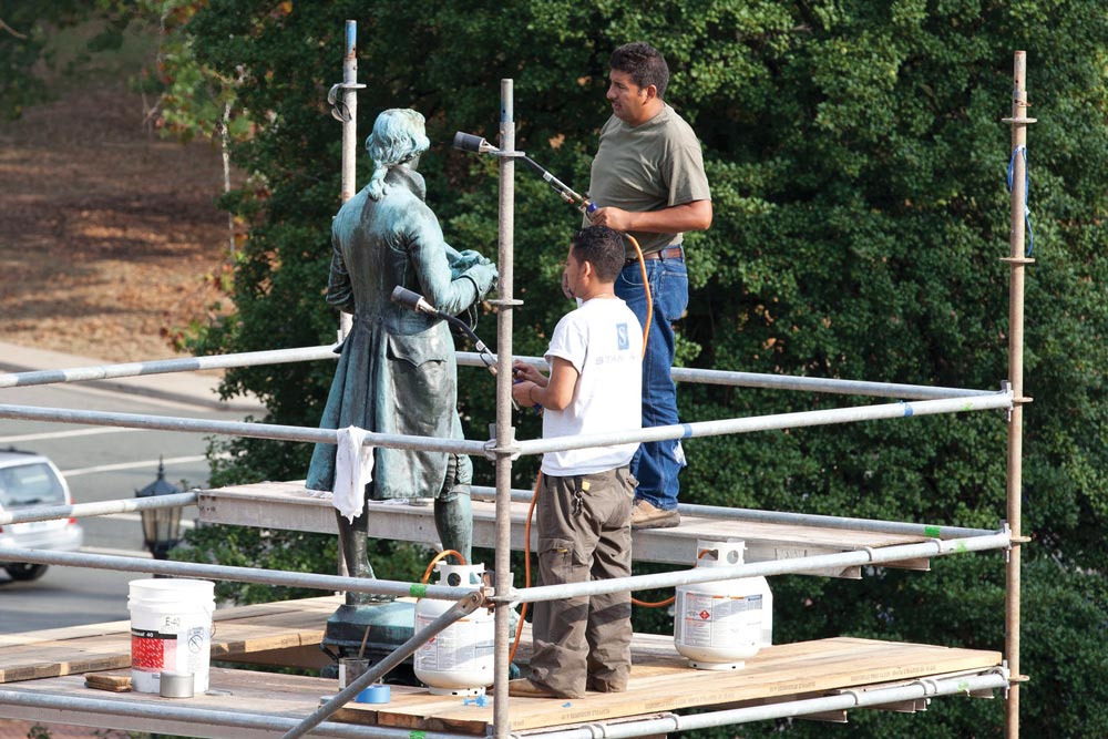 While the Rotunda needs work, the nearby statue of its designer is in great shape after a thorough cleaning and repair. Conservators washed the bronze Thomas Jefferson statue with a mild detergent and applied a coat of hot wax, which inhibits corrosion and brings out the luster of the bronze.