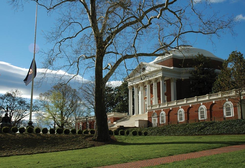 The morning after a Virginia Tech student shot and killed 32 fellow students and faculty on April 16, the Virginia state flag flies at half mast in front of the Rotunda.