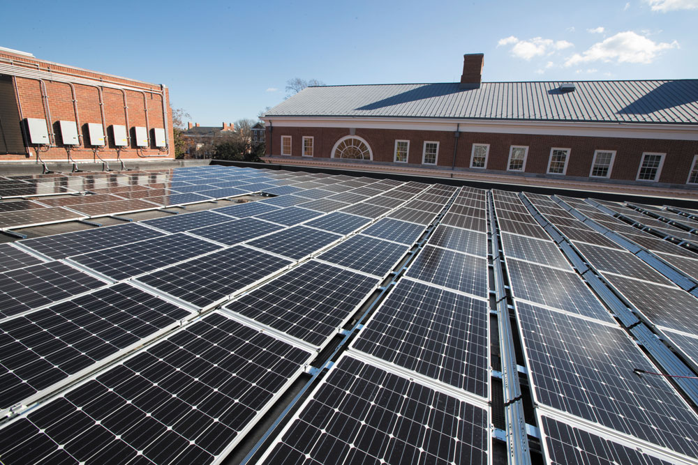 Electricity and fuel use produce most of the school’s greenhouse gases, and in recent years the school has made major changes. In 2009, for example, it switched from coal to natural gas as its primary heat source, and by 2018 had reduced its greenhouse gas emissions by 16.5 percent. Officials attribute much of the success to solar energy: Puller Solar facility and the Hollyfield Solar project (both operated by Dominion Energy), plus solar panels on Clemons Library, Skipwith Hall and the Alderman substation, together produce 21 percent of UVA’s electricity.