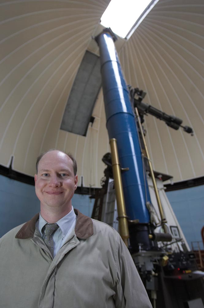 Astronomy professor Edward M. Murphy (Grad ‘93, ‘96) knows how the universe began. He also has a pretty good idea of how it will end, but he doesn’t appear to be worried. While he’s observing galaxies through the telescope at the McCormick Observatory with students or visitors, he reassures, “the night sky is not so mysterious. In fact, we know a great deal about it.” While the planets and stars capture popular attention, Murphy works to demystify the stuff between the stars. At Johns Hopkins University, he worked on the Far Ultraviolet Spectroscopic Explorer (FUSE), a telescope sent into space to measure the gas between stars. Why is he so interested in nearly empty space? “It’s important because it’s a record of what’s happened in the Milky Way in the past, and that gas will go on to form future generations of stars,” he says. “It’s the history of our Milky Way Galaxy written in the interstellar medium.”
