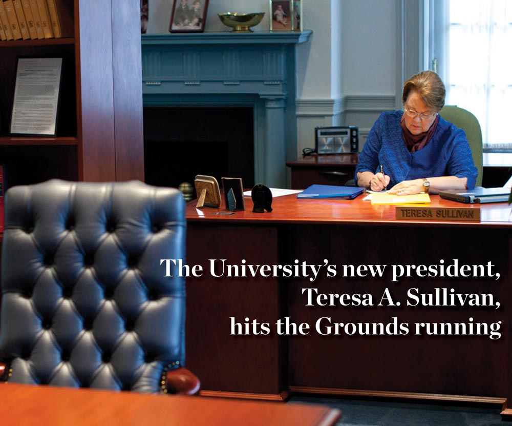 On August 1, 2010, Teresa A. Sullivan became the University of Virginia’s eighth president. She came to UVA from the University of Michigan, where she served as provost and executive vice president of academic affairs. Although she’s been in Charlottesville for only a few months, she seems well on her way to getting to know not only the entire University community but also just about everyone in the commonwealth of Virginia.